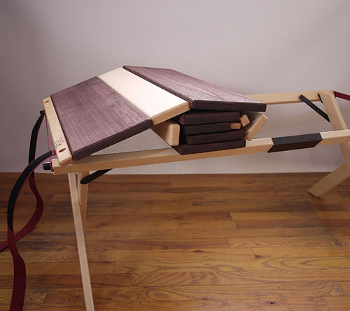 樽型に膨らんだ天板形状に、「紐蝶番」と呼ばれる昔から屏風などに使われてきた折りたたみ機構から着想を得て天板をつなぎ合わせた、表裏どちら側にも折り畳むことができる蛇腹式天板のテーブル。