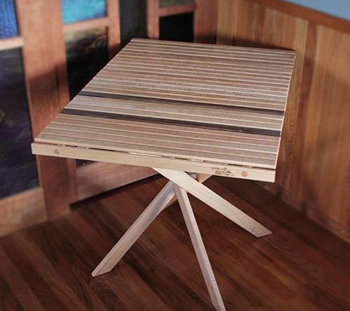 桐とブナの板がリズミカルに並んだ個性的な天板が目を引きます。